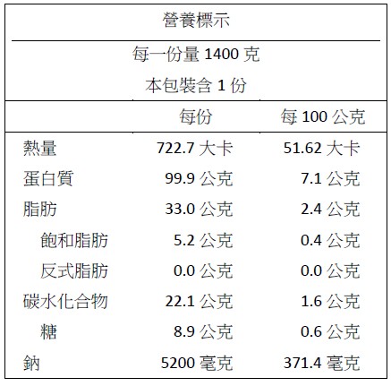(每包熱量:908.4大卡 每包蛋白質:86.3g)